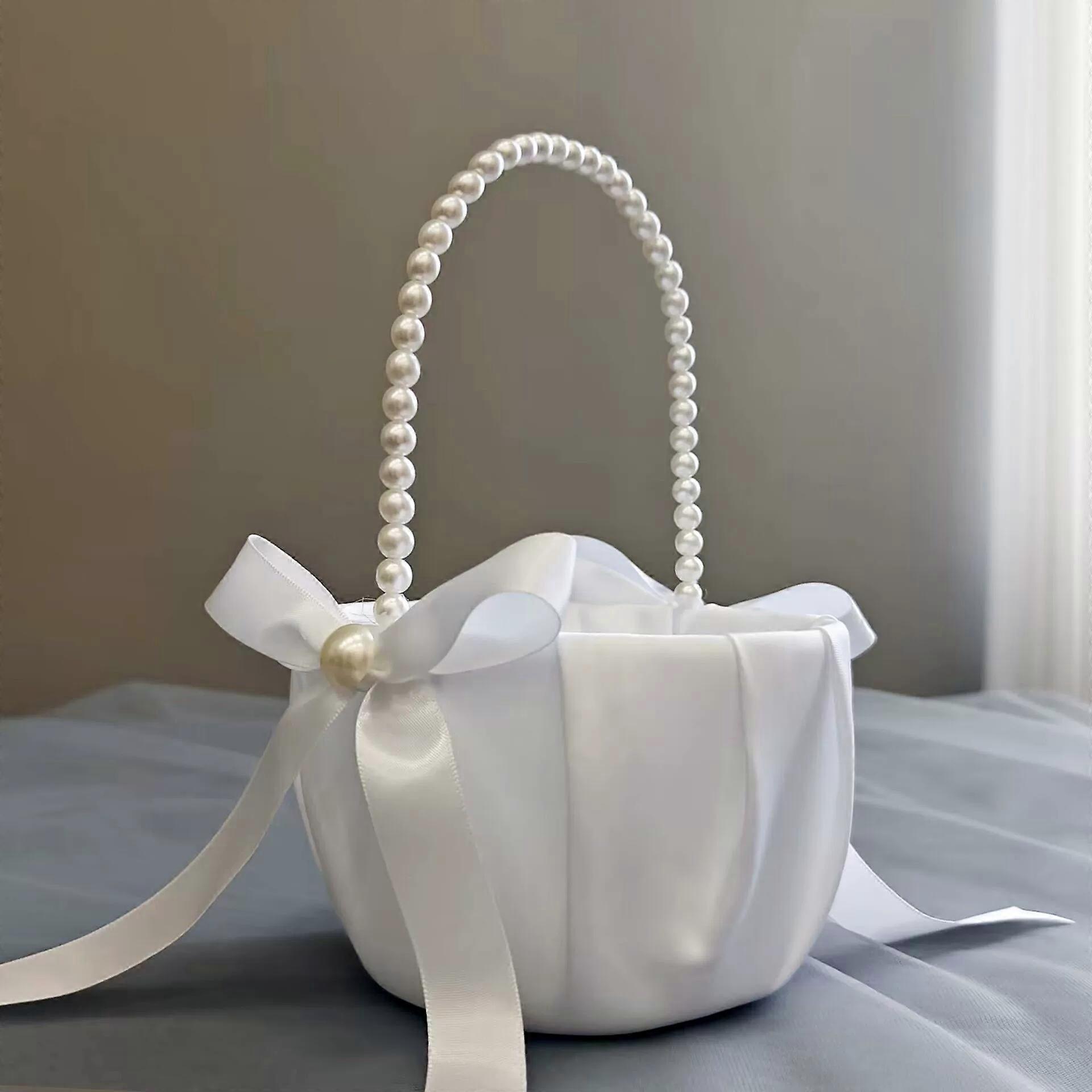 Wedding White Satin Bow Flower basket Flower Carrying basket with pearl handle suitable for bridesmaids and flower girls
