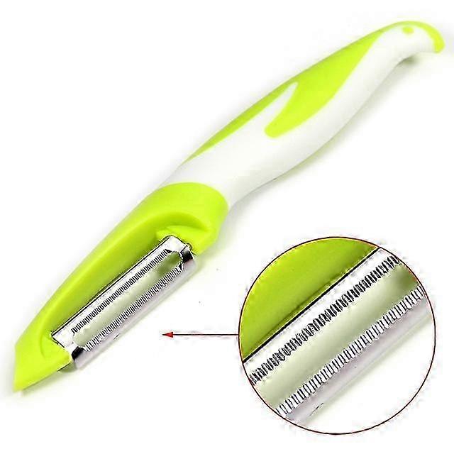Fruit and vegetable peeler with serrated stainless steel blades, ergonomic handle, and potato sprout remover. Light Green.