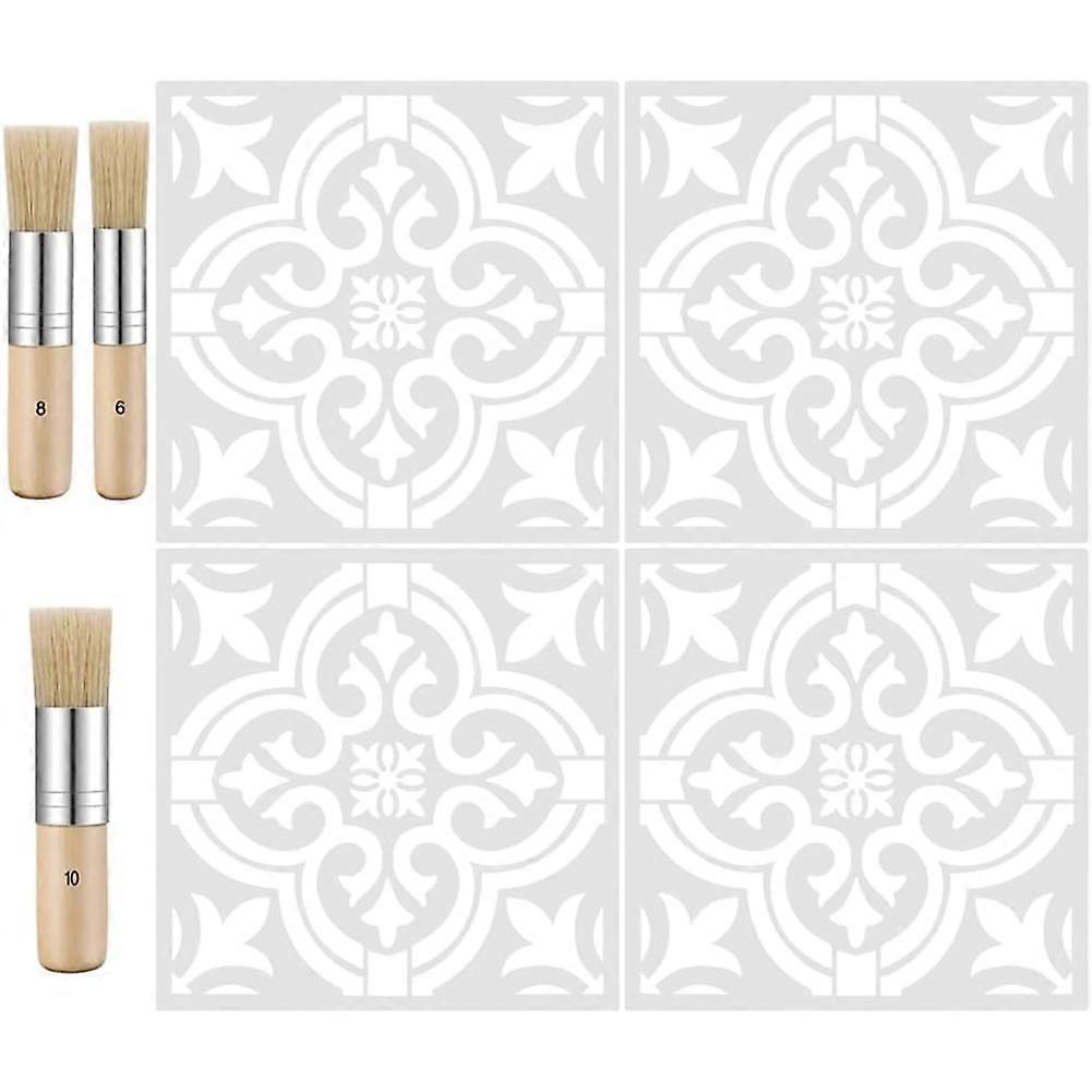 Tile Stencil and Wooden Stencil Brush Set of 7, with 3 Bristle Brushes for Floor, Wall, Cabinet, Home Decor