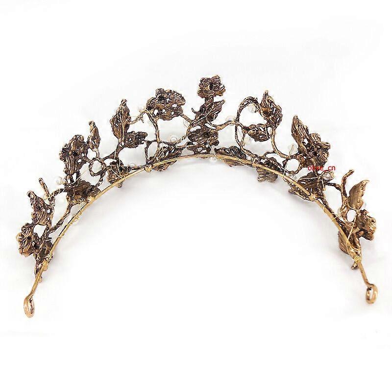 Antique Brass Flower Leaf Pearl Crystal Tiara Crown Wedding Prom Queen For Women