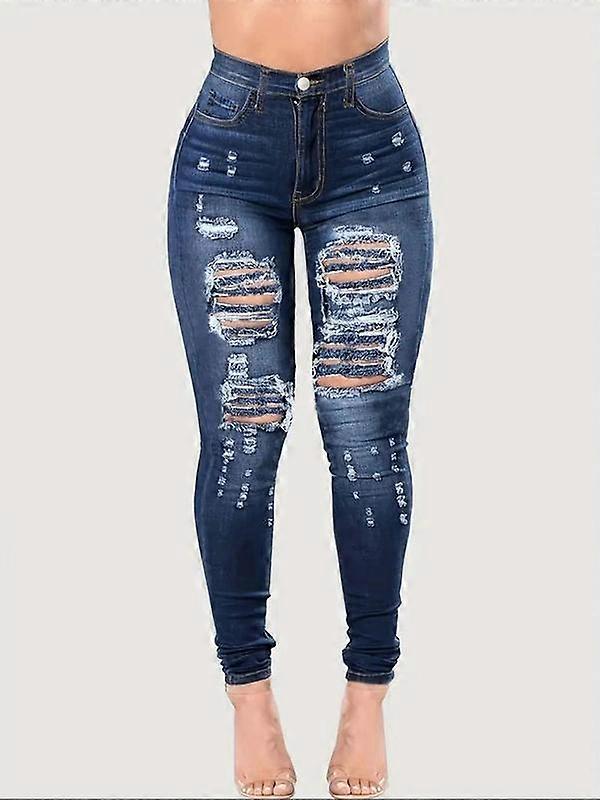 Plus Size Pocket Button Ripped Jeans, Washed Denim Faded Jeans for Women, Casual High Rise Tight Pants for Daily Wear, Women's Bottoms for A