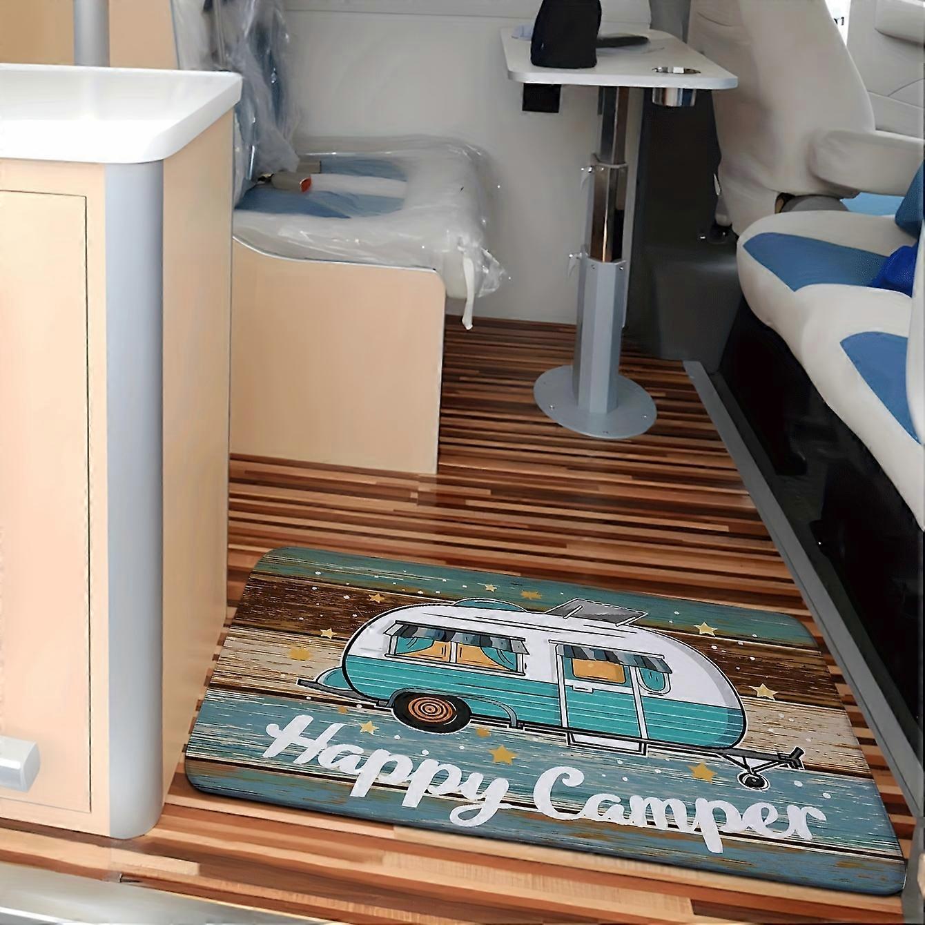 Happy Camper Vintage RV Design Anti-Slip Door Mat - Machine-Washable Crystal Fleece Semi-Circular for Indoor/Outdoor Use