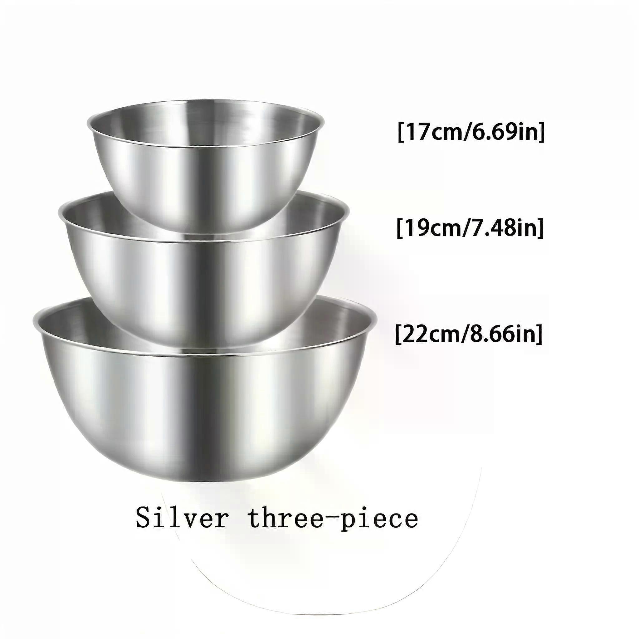 A set of three stainless steel bowls for mixing, kneading dough, and serving salads, suitable for kitchen use.