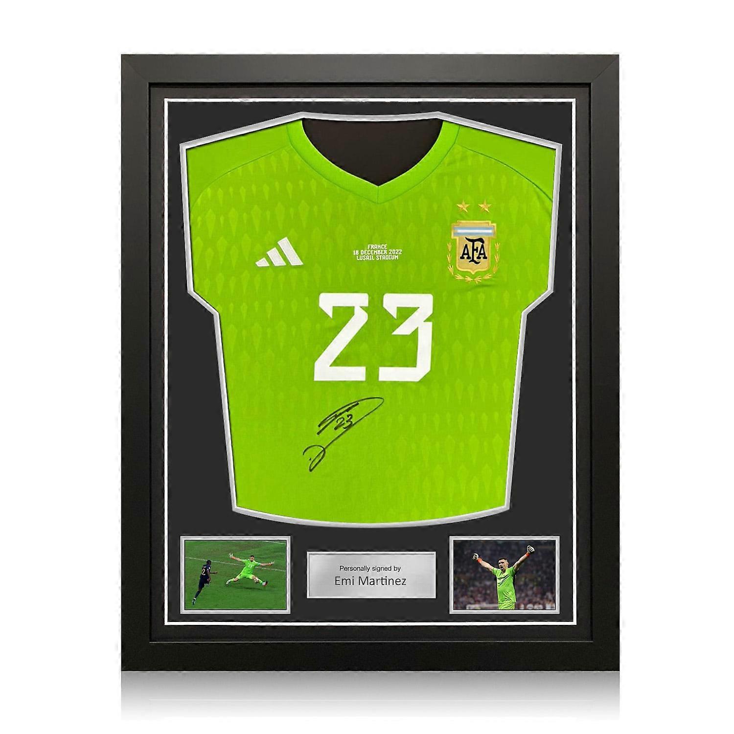 Original Official Argentina 2022-23 Home Goalkeeper Shirt, 2022 World Cup Final Edition, signed by Emiliano Martinez. In standard black frame. Approximate size: 840 x 670 mm / 33 x 26.5 inches / This Argentina goalkeeper shirt was signed by Emiliano Martinez in Little Aston on November 28th, 2025. Emi played a pivotal role in Argentina's 2022 World Cup winning campaign. Emi saved two penalties in a shoot-out against the Netherlands in the quarter-final, helping his team advance to the semi-final. The final ended 3-3 at the end of regulation time, going into extra time and then penalties. Emi made two key saves during the last minute of extra time and the decisive penalty shoot-out- helping Argentina win 4-2 on penalties. Martinez was awarded the Golden Glove for his performances in the tournament and also won the 2022 The Best FIFA Men's Goalkeeper award. All signatures are originals they are never printed. The product image is a stock photo so the position of signatures might vary slightly. Exclusive Memorabilia unconditionally guarantees all signed items are genuine. The item will come with a certificate of authenticity featuring a numbered hologram that matches an identical hologram affixed to the product. Exclusive Memorabilia is the UK's most trusted brand of sports and entertainment memorabilia, supplying Premiership football clubs, leading cruise lines and charities with their memorabilia for sale and auction.