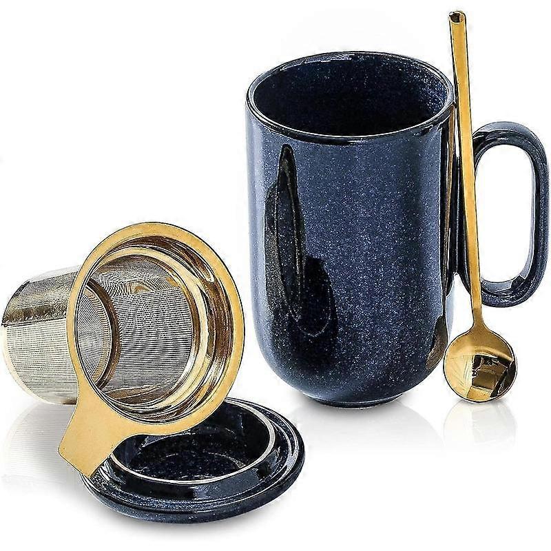 Ceramic Cup Mug Infuser - Large 16 oz Hot Loose Steeping Handle Teacup with Leaf Infuser Spoon Lid - Blue Tall Glazed Strainer Coffee Mug