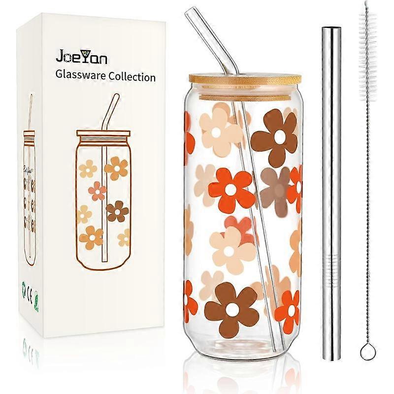 20 oz Glass Cups With and Straws,Boho Can Shaped Drinking Glasses,Cute Iced Coffee Tumbler with Colored Floral , Smoothie Soda Glassware