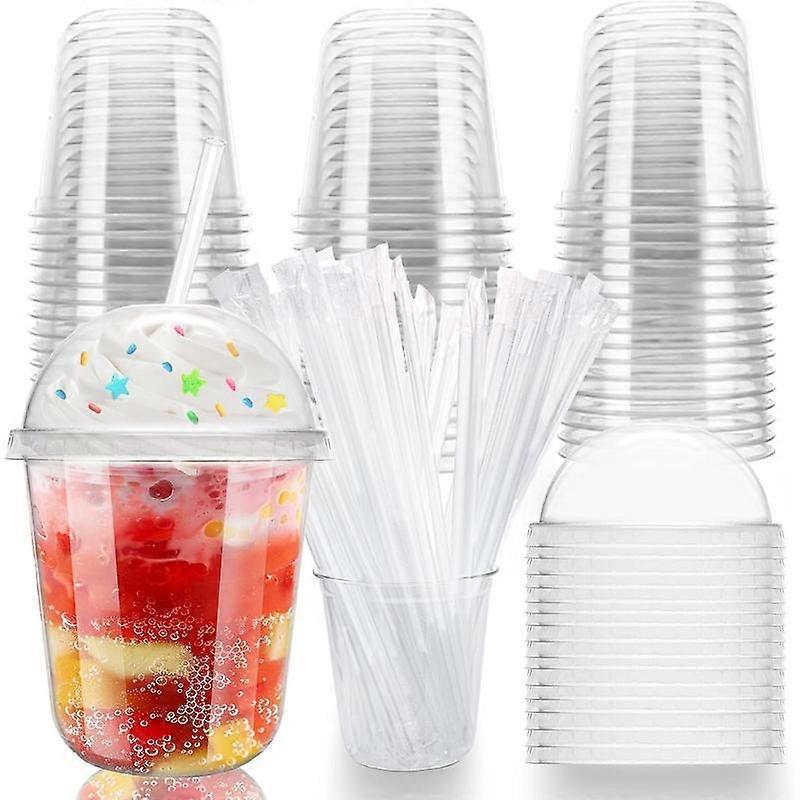 12oz Disposable Stemless Glasses With Dome and Straws,PET Disposable Drinking Cups,Clear Plastic Glasses for Parties Birthday,Wedding,Meet