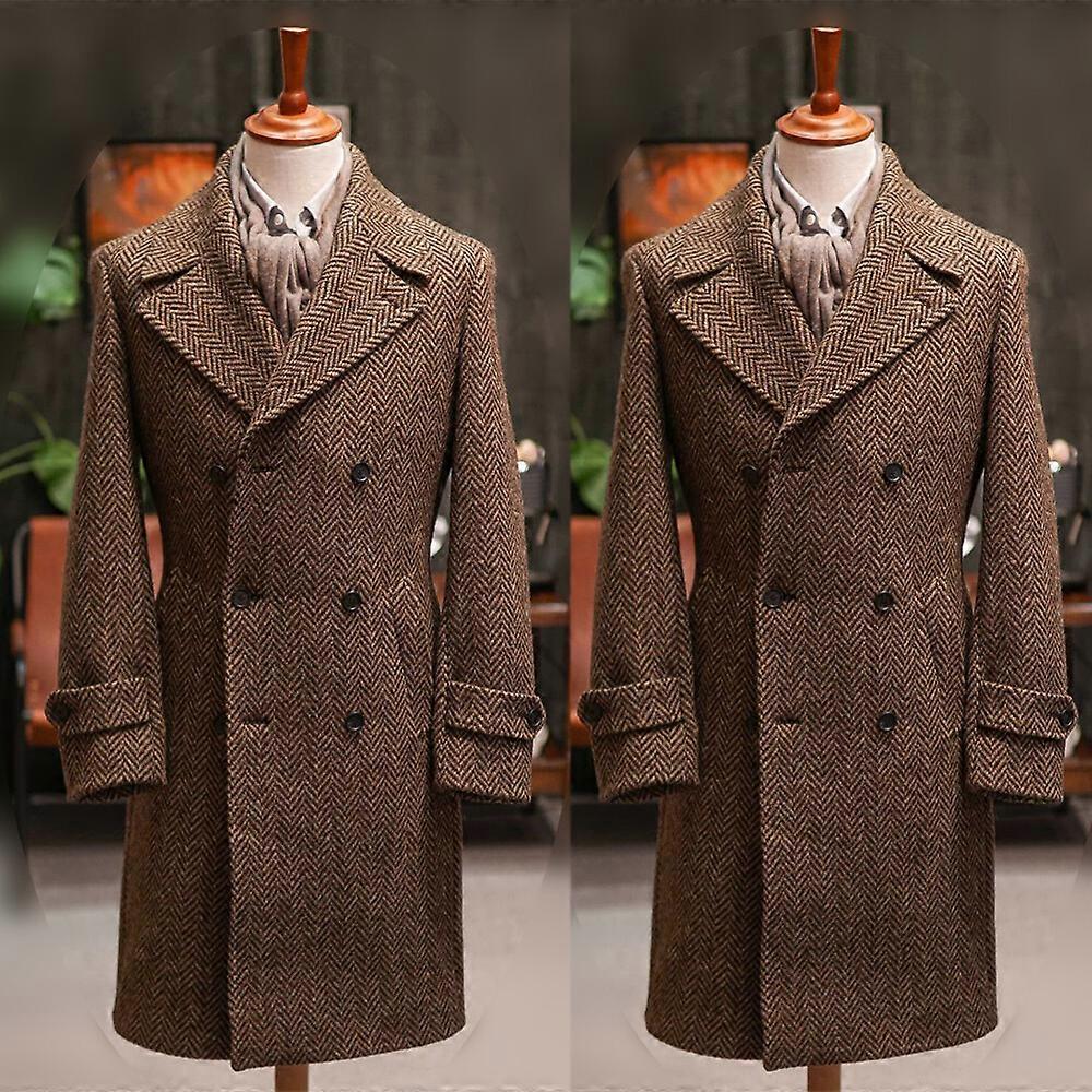 Brown Men Herringbone Overcoat Blazer Notch Lapel Double Breasted Tuxedos Coats