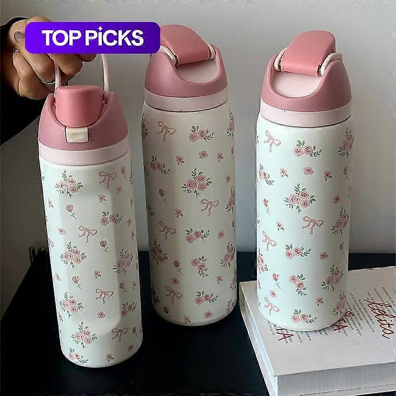 Floral Pattern Vacuum Flask, 1 Count Portable Large Capacity Water Bottle with Straw, Drinking Cup for Home Office School Outdoor Camping, I