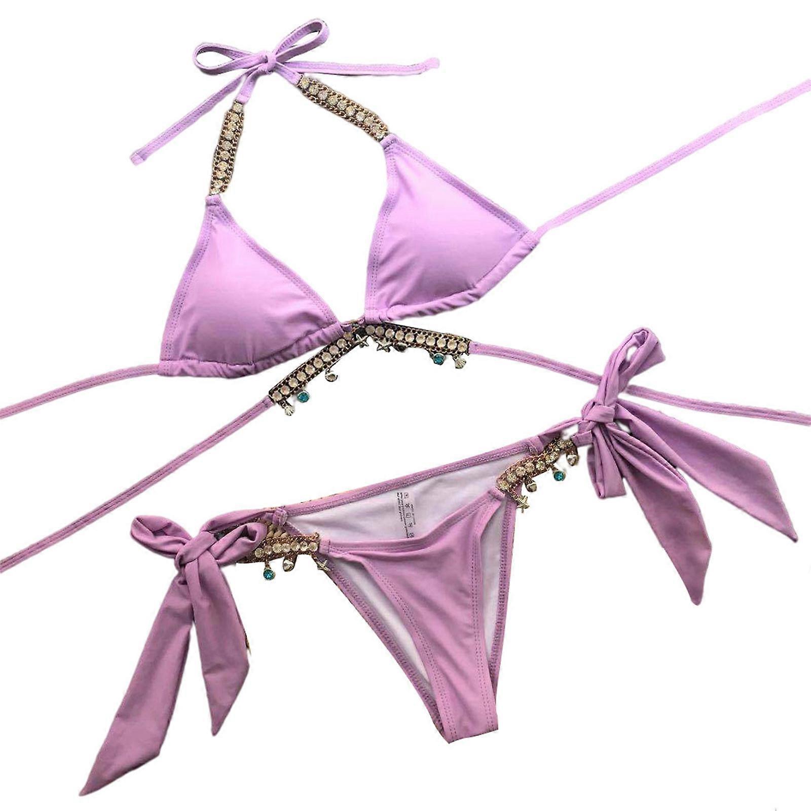 Women Two Pieces Sexy Thong Swimsuits Push Up Brazilian Bikini Female Lacing Swimwear Bikinis Bathing Suit Beachwear Purple S