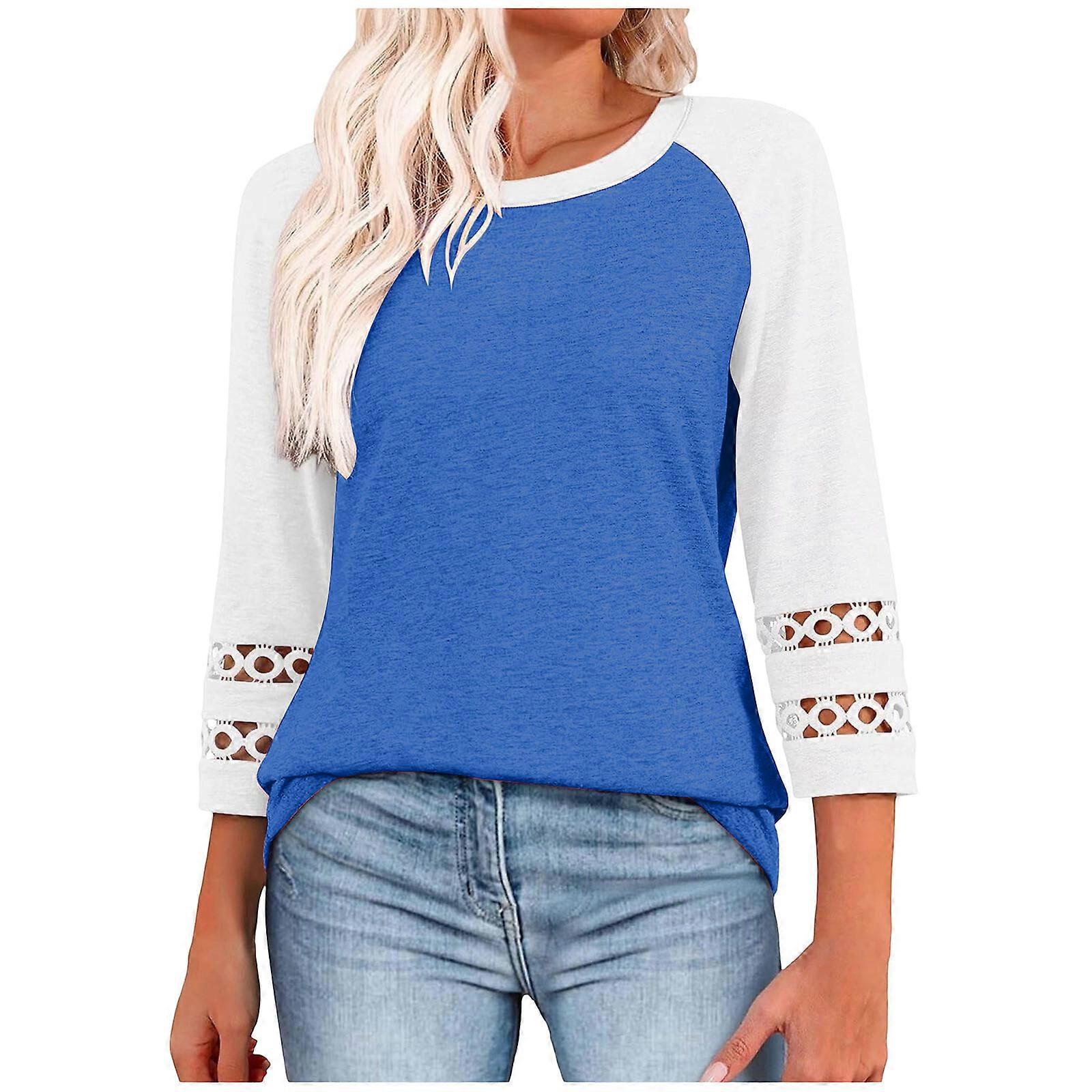 Womens Lace Patchwork 3/4 Sleeve Tops Trendy Crewneck Raglan T-Shirts Color Blocking Blouse royal blue XL