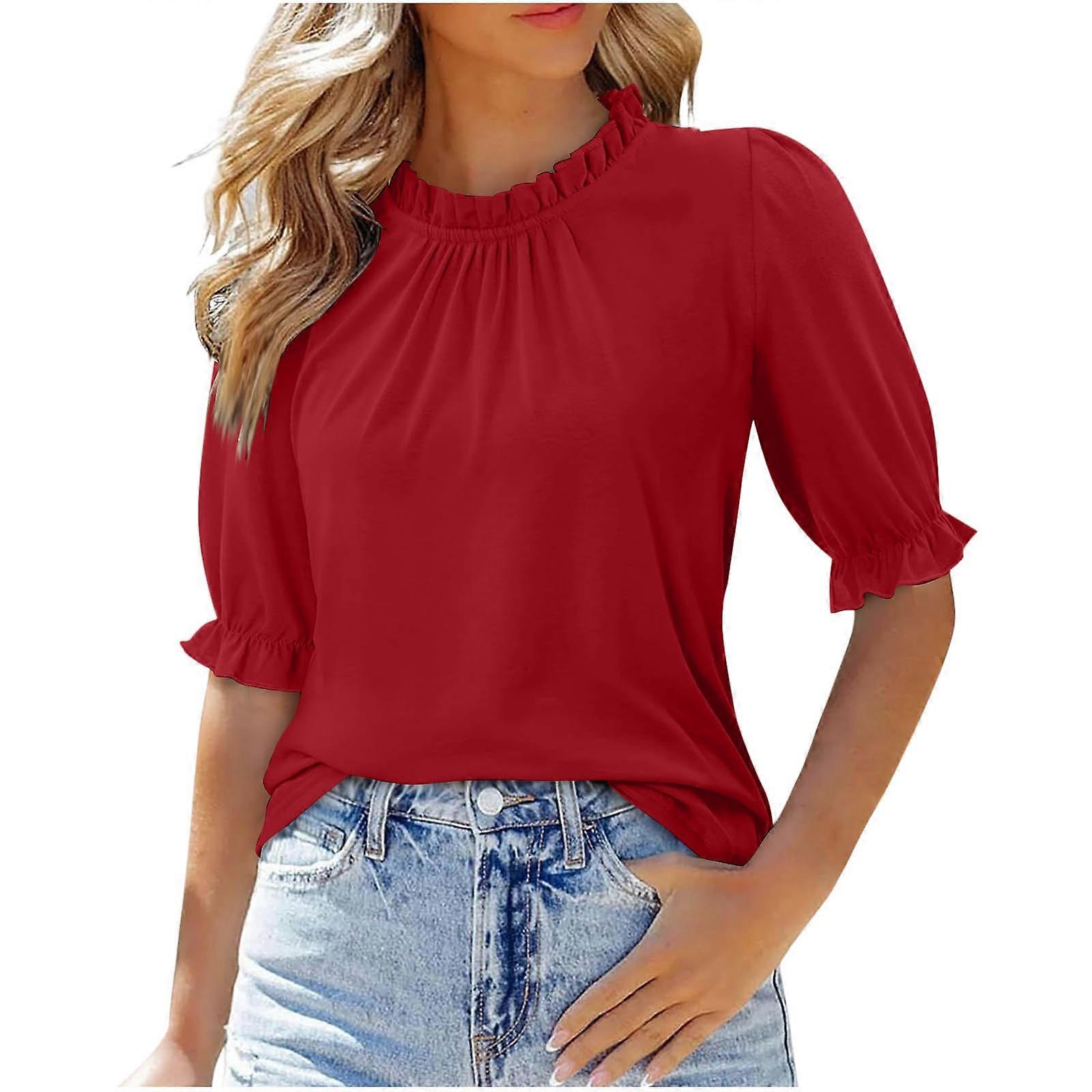 Women's high-neck casual top with ruffled short sleeves and a backless bohemian style shirt Red XL