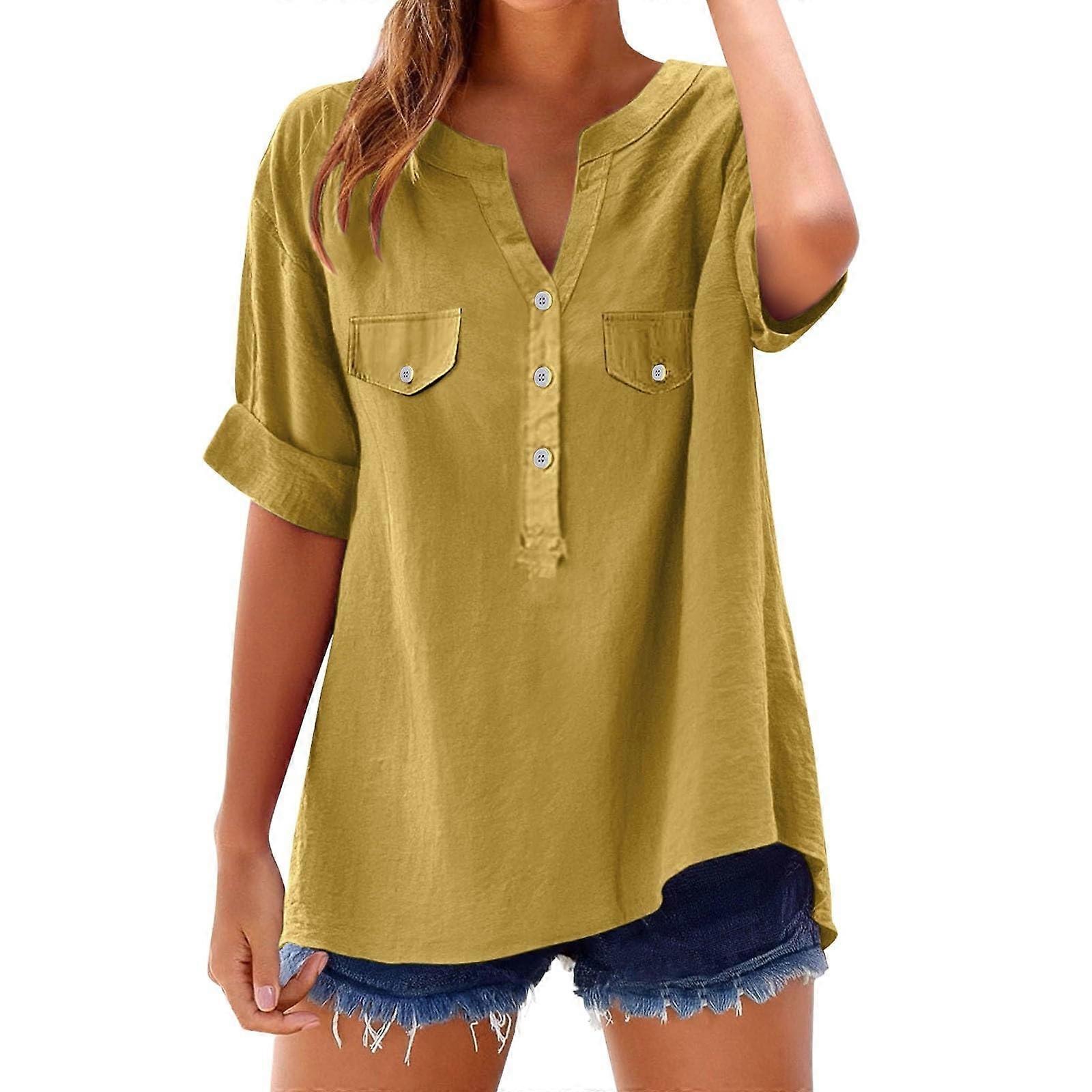 Women's button-down linen clothing, comfortable and loose three-quarter sleeve shirt, casual solid color V-neck T-shirt Yellow XL