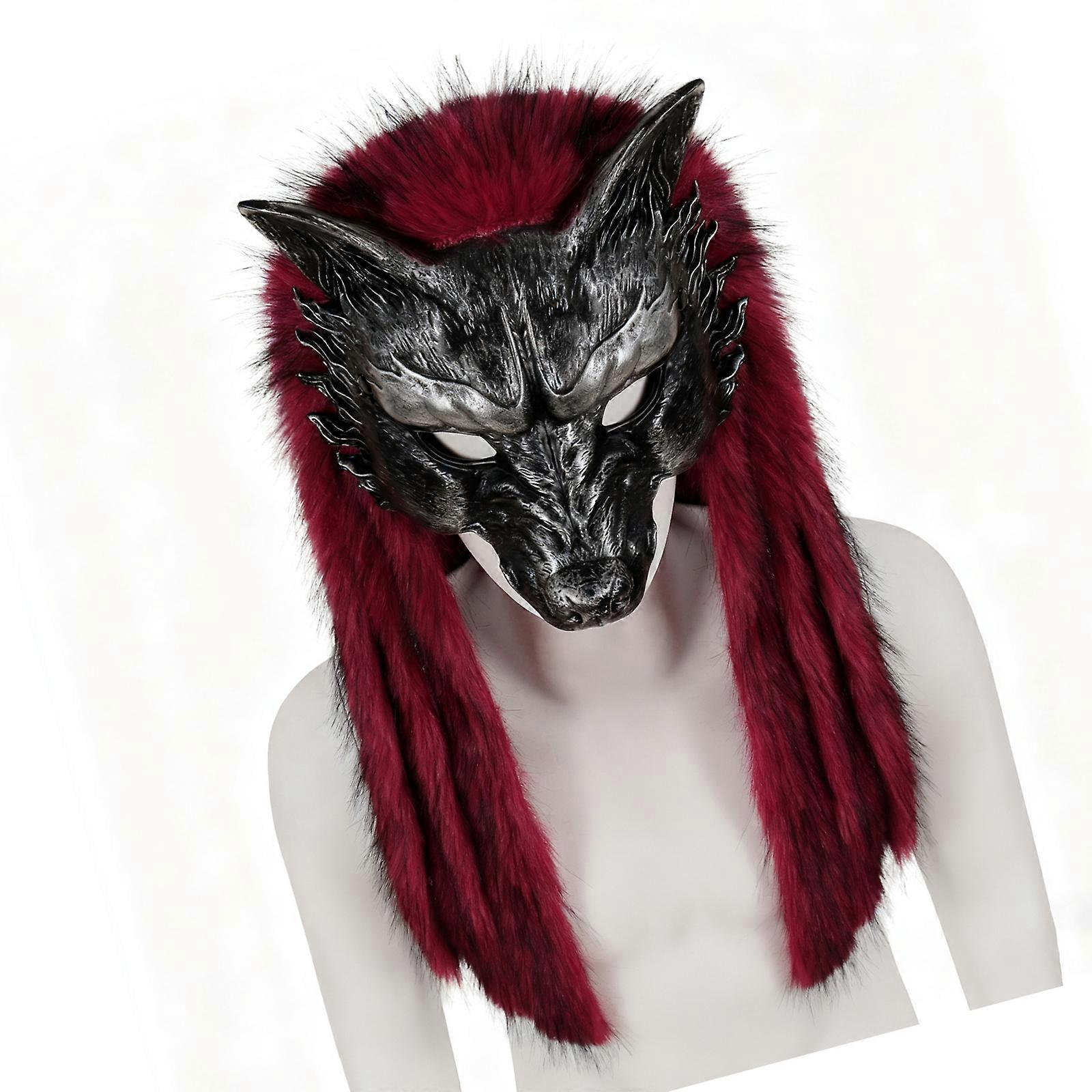Wolf Mask Faux Furs Vikinges Foxes Mask Wendigo Headdress for Halloween Werewolfs Costume Barbarian Cosplay Party Burgundy