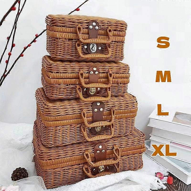Vintage Rattan Woven Storage Basket with Handle Rectangular Stackable Organizer for Picnics Home Decor Living Room Shelf Baskets
