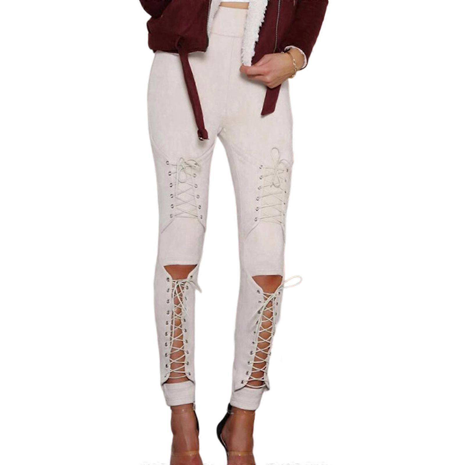 Women's Trendy Faux Suedes Skinny Long Pants with Tie Up Cutout Front Punk Rock Leggings Slimming Trousers Streetwear Khaki XL