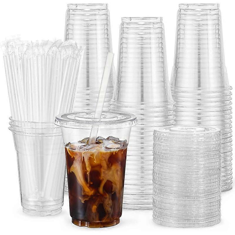 [100 Sets - 16oz] Clear Plastic Cups with Lids and Straws, Disposable Iced Coffee Cups for Smoothie, Milkshake, Cold Drinks -