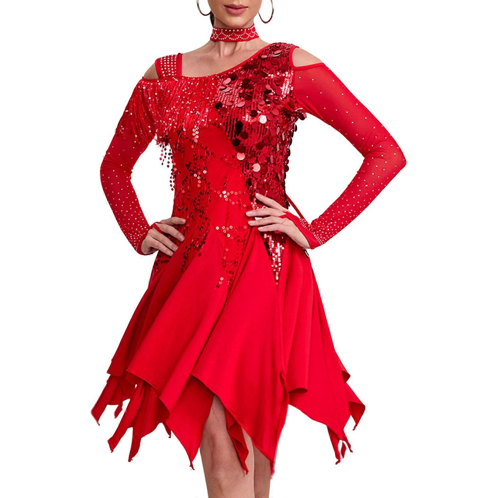 Elegant Latin Dance Gown Full Sleeve Fringe Design Polyester Fabric Dance Dress for Dancing and Stage Shows XL Red