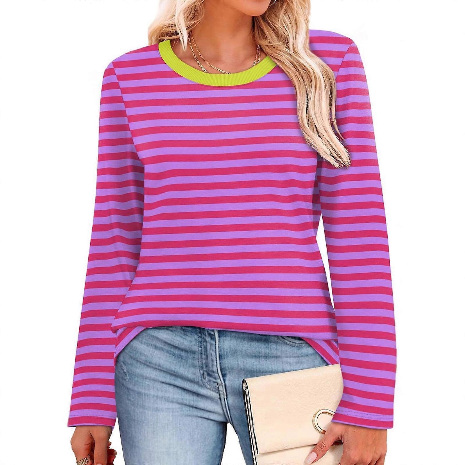 Women's Long Sleeve Pullover Blouse Striped Color Block Design Tee Top Ribbed Crewneck Casual Loose Shirt For Daily Wear rose red XL