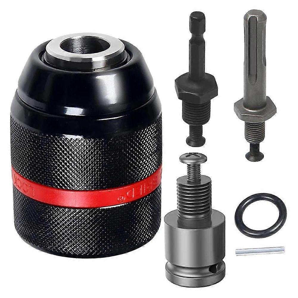Replacement drill chuck: A 1/2 - 20UNF, 2-13mm self - tighten keyless drill chuck made of high - quality alloy steel. It has strong clamping force, good wear resistance and stable performance. Self - tightening Ratchet Design: No chuck key needed. Ratchet sound prompts when tightening or loosening. Easy to operate and boosts work efficiency. Wide Compatibility: With 1/2 - 20UNF thread and 2-13mm clamping range, it fits most electric drills like for Milwaukee, for Dewalt, etc. Adaptable Shank Compatibility: Comes with a 3/8Inch to 1/2Inch adapter for seamless use with 3/8Inch SDS - Plus and 1/4Inch hex shanks. Convenient and practical: Easily convert your rotary hammer/impact wrench/impact Screwdriver into a drill rather than spending money having multiple. Color:As Shown Material:Metal Package Contents: 1 * drill chuck adapter set Only the above package content, other products are not included. Note: Light reflection and different displays may cause the color of the item in the picture a little different from the real thing. The measurement allowed error is +/- 1-3cm.