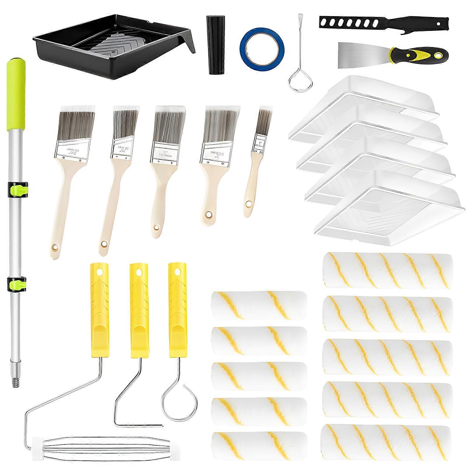 Features: This 29 piece paint roller set delivers versatile painting solution with high absorption polyester rollers that minimize drips, ensuring even coverage for various surfaces sizes and making it a top option for painting tools sets. Featuring sturdy iron handles, plastic frames, and polyester rollers, the set offer sturdy construction, easy cleaning, and long time performances for efficient use in any project. Ideal for craft enthusiasts, homeowners, and professional painters, it caters to users seeking efficient and dependable roller brush sets for both casual and intensive tasks. Perfect for interior and exterior surfaces like wall, ceilings, furniture, and floors, it handles scenarios such as renovations,repairs, and creative color changes with ease. Experience comprehensive painting efficiency with this roller brush set, providing smooth application on paint types like latex and wood finishes for unflawed results every time. Specifications: Materials: Iron, Plastic, Polyester Size:AsS Shown in the Picture Package Includes: 28Pcs Paint Roller Brush Set note: 1.Please allow 1-2cm errors due to manual measurement, making sure that you not mind before order. 2.Due to the differences between different monitors, the picture may not reflect the actual of the item.