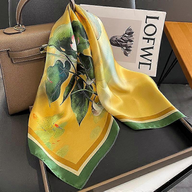 100% Silk Scarf Women Chinese Yellow Green Lotus Kerchief Headscarf Tied 68*68cm