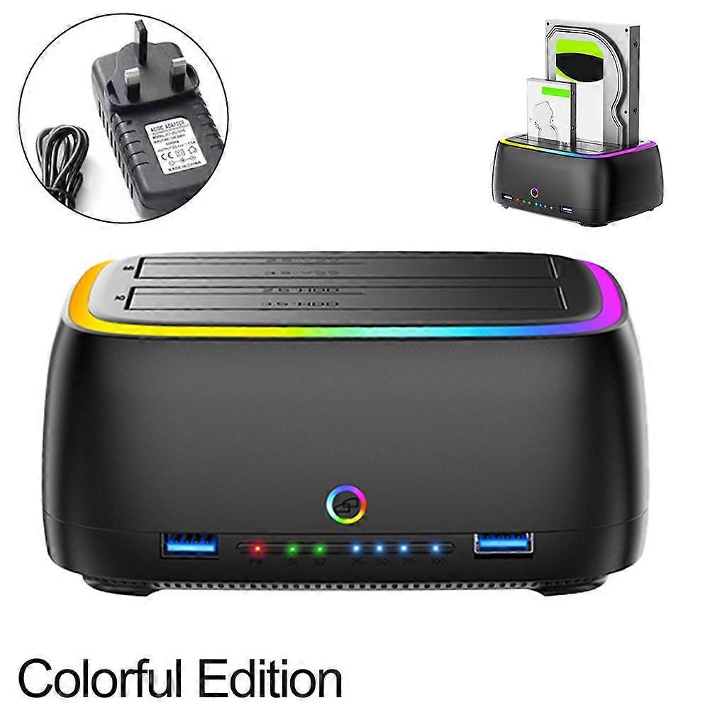 1. : **Efficient One-Key Offline Cloning** This versatile docking station supports 2.5-inch and 3.5-inch SATA I/II/III HDDs and SSDs, allowing for effortless one-key offline cloning. Directly replicate data from one drive to another without needing a computer, ensuring 100% data integrity for seamless backups or drive upgrades. It accommodates large capacities, supporting drives up to an impressive 22TB. 2. : **High-Speed Data Transfer & Advanced Connectivity** Experience rapid data access with Type-C to SATA 3.0 dual high-speed transfer, enhanced by UASP acceleration protocol. Achieve theoretical speeds up to 420MB/s, enabling you to transfer a 1GB file in approximately 3 seconds. Beyond core functionality, this model offers advanced expansion with a built-in USB HUB and convenient TF/SD card reader slots, providing additional versatility for your digital needs. 3. Compact Design with Superior Heat Management: Crafted with a sleek, compact casing, this docking station measures approximately 14 cm (5.5 inches) in length, 10 cm (3.9 inches) in width, and 7 cm (2.8 inches) in height. Its well-ventilated design features 360° all-around heat dissipation, including a perimeter of ventilation holes at the base. Raised silicone feet further promote airflow and stability, maintaining optimal performance during extended use. 4. : **Dynamic RGB Light Effects** Elevate your workspace aesthetic with vibrant RGB light effects. The dynamic seven-color light design instantly enhances the technological ambiance of your setup, adding a visually appealing and engaging to your daily operations. 5. : **User-Friendly Plug-and-Play Operation** Designed for convenience, this HDD docking station features a vertical insertion design for easy drive installation and removal. Its plug-and-play functionality ensures quick setup without complex drivers, making it an ideal solution for professionals and enthusiasts alike who require reliable and swift data management. Package list 12V 3A power supply, USB 3.0 cable, instruction manual