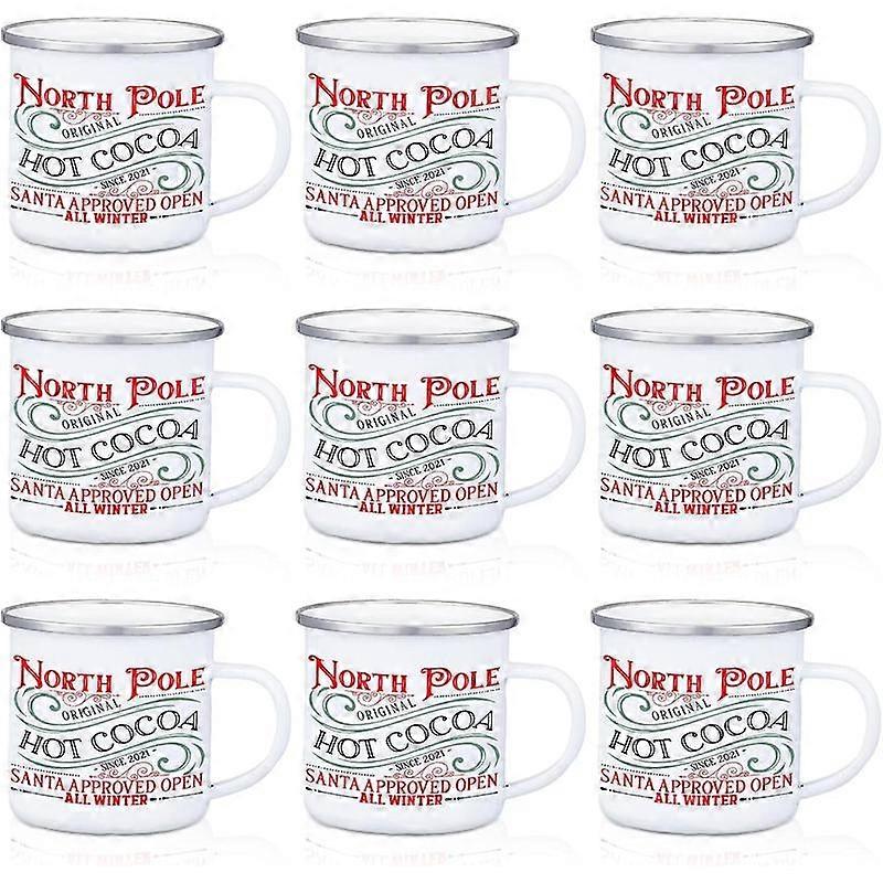 9 count North Pole Hot Mug Christmas Coffee Mugs Christmas Gifts Enamel Mugs Santa Theme Design Xmas Coffee Cups with Handle Stainless Stee
