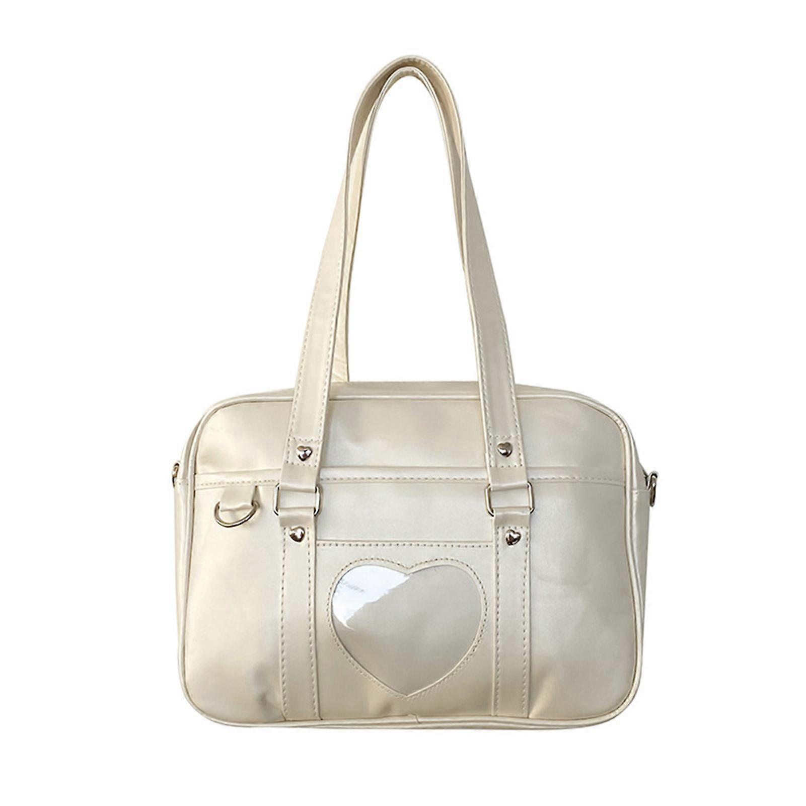 Features: Japanese Style Design: Embrace the Japanese high school fashion aesthetic. Large Capacity: Spacious interior designed to hold all your daily essential, books, and school supply Charming Heart-Shaped Accents: Features a delightful peach heart detail for a cute and unique touch. Versatile Hand Tote Bag: Designed for comfortable hand-carrying, making it easy to transport. Ideal for Students: A practical and stylish choice for high school, college, or any student. Sturdy & Practical: Constructed to withstand daily use while maintaining its stylish appearance. Notice: *Actual color may be slightly different from the image due to different light effect *Please allow 1-3cm deviation due to manual measurement Description: Size: 32*10*23cm Material: PU Package List: 1X Style Heart Cross-Body Bag