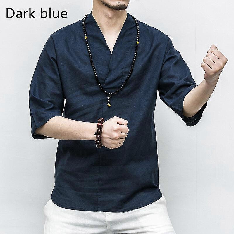 Men Cotton Linen Shirt V-neck 3/4 Sleeve T-shirt Top Kung Fu Chinese Retro Style
