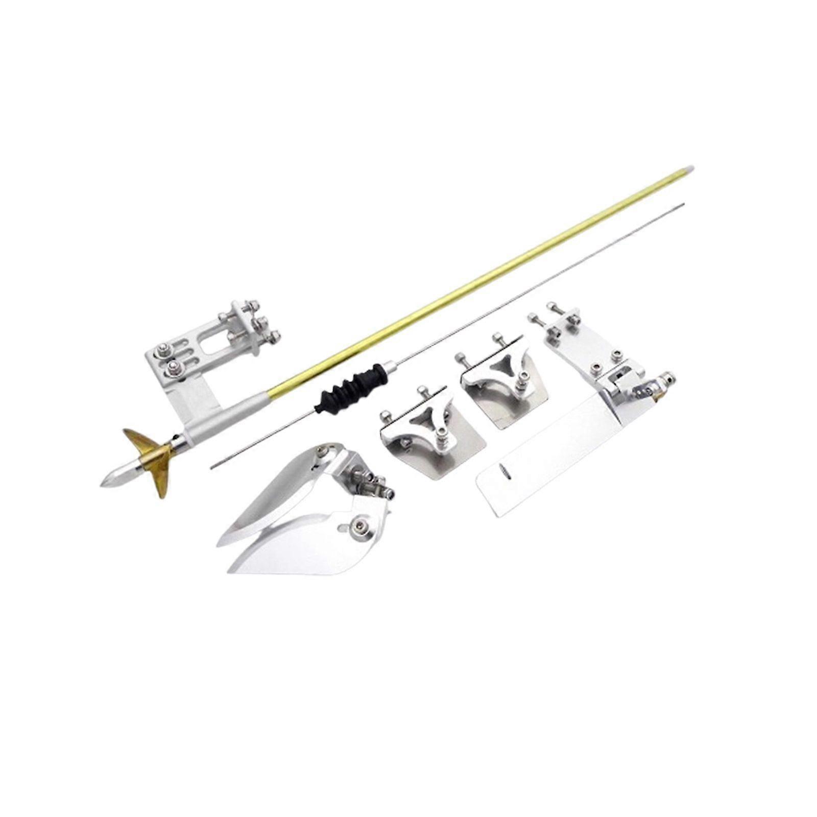 4mm Flexible Shaft + Shaft Strut + Rudder + propeller + Turn Fins + Trim Tabs kit for RC Boat Speed MONO -- Description -- These assemble kits apply to electri RC boat, speed MONO, Vee/Oval boat etc. There are two self-lubricating bearing sleeves in the Strut Sleeve to ensure that the shaft works smoothly and stably. This flex-cable made of spiral-wound steel, the flex-cable and stub shaft are welded together. They are easy to install,and allow the drive shaft to be installed parallel to the waterline. The rudder comes with water pickup, it is convenience to build cooling system for motor,ESC etc. It is suitable 45-70cm long boat. -- Specification & Features -- - RC boat spare parts - Material: aluminum alloy and stainless steel - Flexible shaft diamter: 4mm - Shaft length: 350mm - Trim tabs: 38mm*31mm - 55mm*21mm Turn Fins - Rudder blade size: 95mm*20mm - Propeller diameter: 35mm - Propeller Type: Copper, Left_ Hand, 2-blades -- Item Contains -- 1x 350mm flexiable shaft (with washer,bullet, drive dog ) 1x 300mm copper shaft sleeve 1x 300mm PTFE tube 1x shaft strut 1x 55mm Turn Fins 1x Trim tabs 1x 95mm rudder 1x 35mm copper propeller 1x 300mm long Linkage with rubber bellow