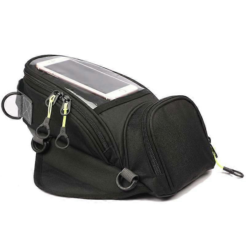 【Durable Material】: This motorcycle tank bag is made of oxford cloth fabric, which is highly wear-resistant and has a certain waterproof function. Even on rainy days, you don't have to worry about the bag getting wet. And it also has good fading resistance and durability, and can be exposed to the sun for a long time. 【Magnetic Base】: Our bag has two magnetic bases. The strong magnetic buckle ensures that the motorcycle tank bag is firmly and safely fixed to the motorcycle. In addition, the fixing strap that comes with the tank bag can be fixed to the front of the motorcycle, providing double assurance that the bag is stably fixed to the tank. 【Large Capacity Storage】: This motorcycle tank bag has a total of three pockets. The transparent pocket is suitable for mobile phone GPS devices; the small pocket is suitable for small items such as change and parking cards; the main pocket can hold large items such as umbrellas and wrenches. The tank bag expands the storage space of the motorcycle, allowing you to place items at any time. 【Transparent Pocket】: The surface of the motorcycle tank bag has a transparent PVC material pocket for your mobile phone or GPS device. You can easily navigate and answer calls without stopping, giving you a safer and more comfortable riding experience. And the transparent pocket has a reflective piping, which is clearly visible even in low light conditions. 【Easy to Use】: This tank bag is easy to use. Just put it on the tank, adjust the position, and the strong magnets will hold the bag in place. There is also a fixing strap with a buckle to hold the bag more securely. In addition, when you want to take off the tank bag, you need to take it off slowly to prevent the strong magnetic resistance from scratching the surface of the tank.