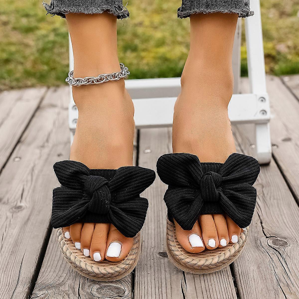 Women Slippers Bowknot Beach Sandals Elegant Open-Toe Flat Shoes Women Solid Color Vacation Lightweight Sandals Slides Women