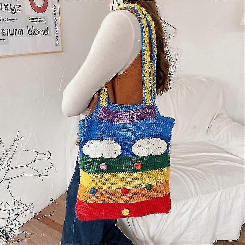 Knitted rainbow-colored women's shoulder bag, classic large size shopping bag, casual women's handbag, girl's tote bag, Big Size