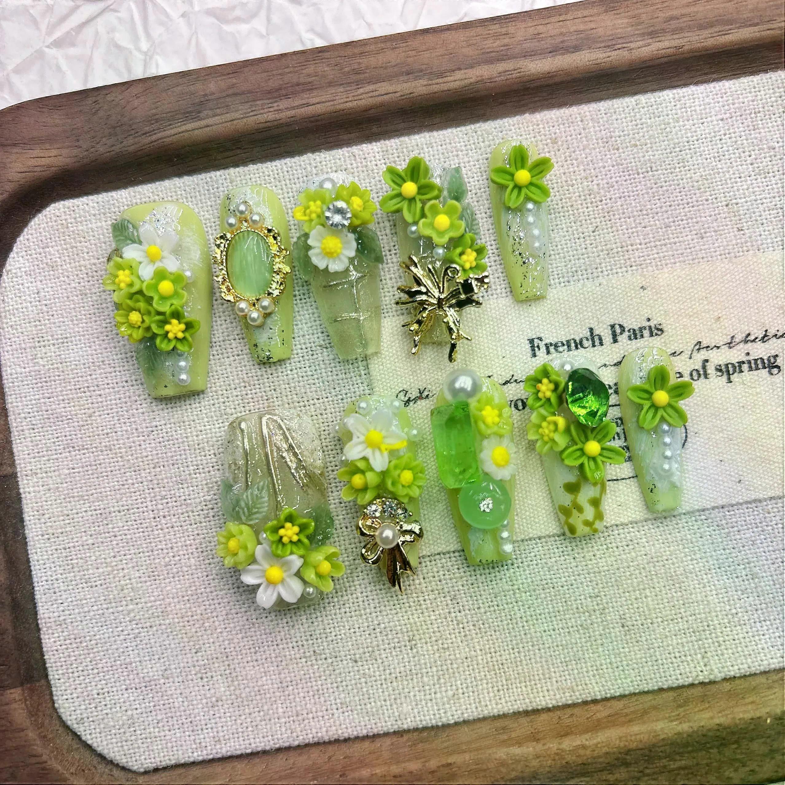 Eco-Friendly Resin Press-On Nails - Spring Floral Design with Pearls Crystals & Metallic Accents French Chic Style for Outings