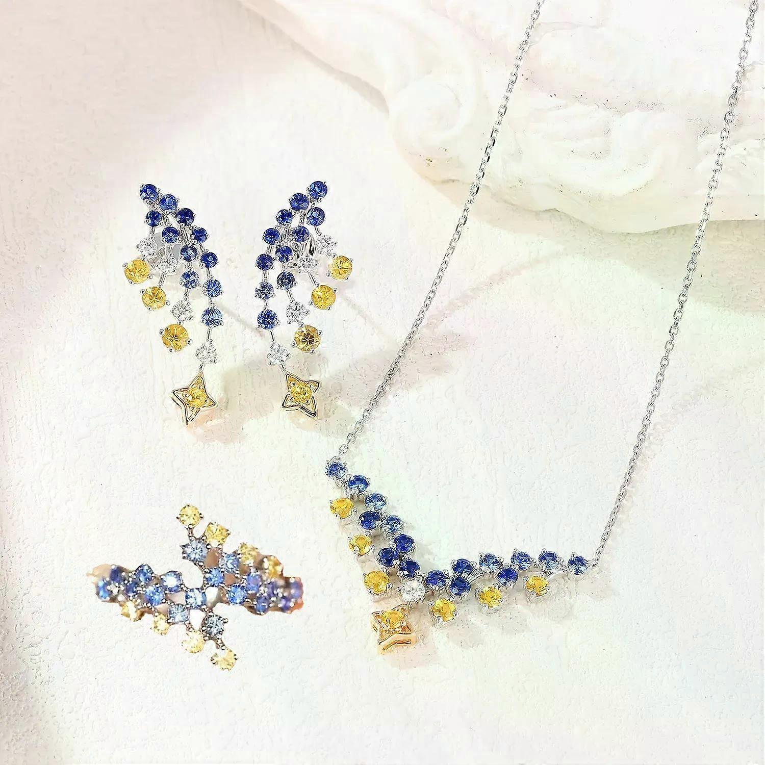 French Retro Van Gogh Star Night Design Jewelry Gradient Blue and Yellow Zircon Pendant Necklaces Earrings Rings Sets For Women