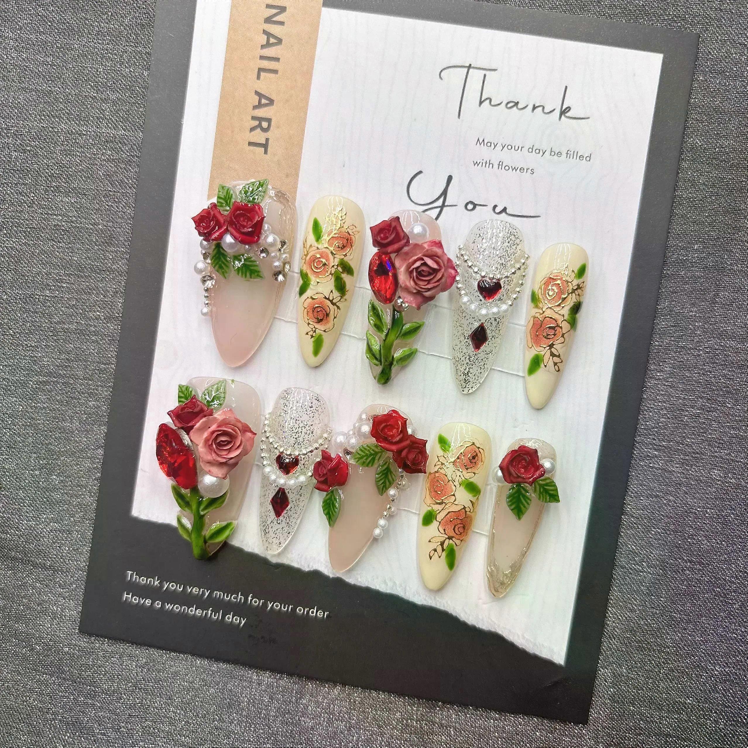 Elegant Floral Pearl Press on Nails with Rhinestones False Nails for Wedding Party Date Romantic Glamorous Acrylic Nails for Wom