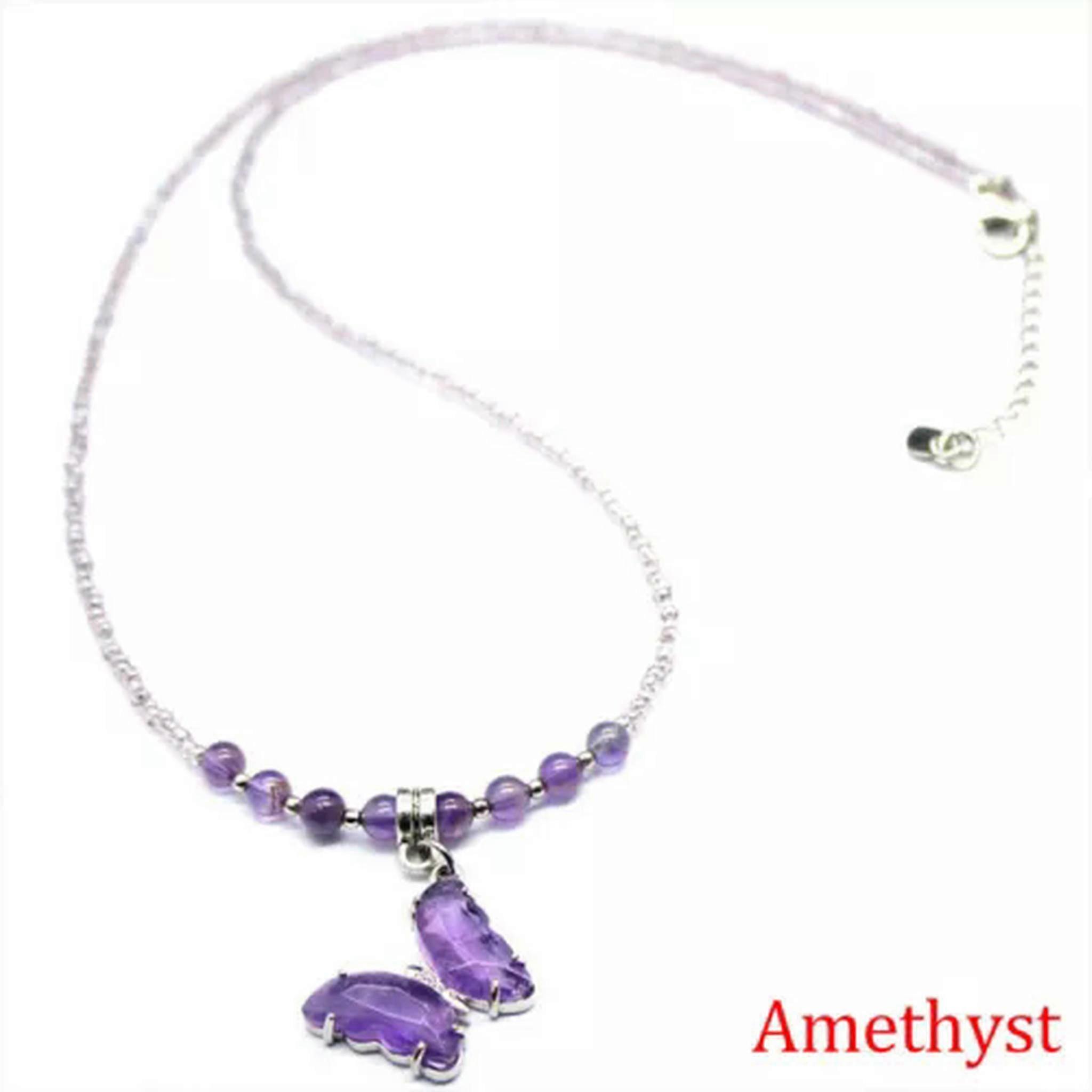 RSAMD Chakra Crystal Beads Butterfly Pendant Necklace Natural Quartz Chain Reiki Gifts-Amethyst-1PC (Random Pick)