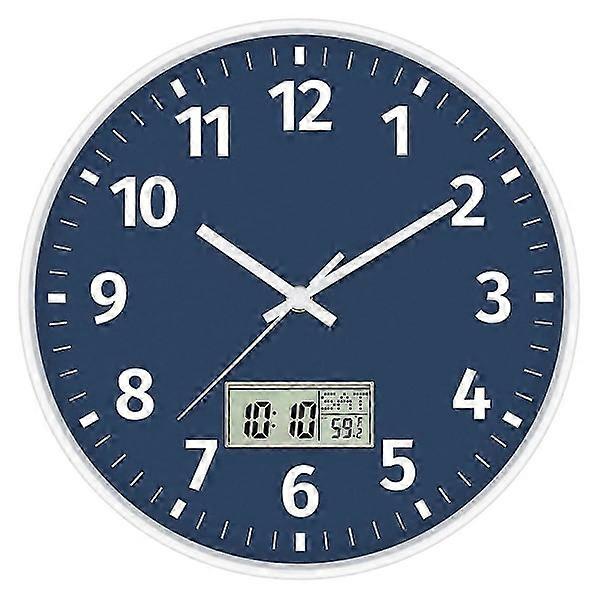 Digital wall clock with time, day of the week and temperature, silent, non-ticking, battery-operated, round