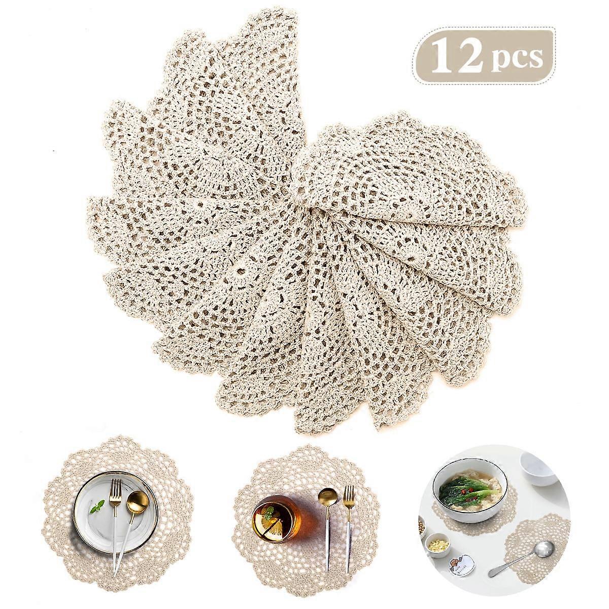 Doilies, 12Pcs 8 Inch Doilies Crochet Round Lace Doily Handmade Placemats 100% Cotton Crocheted Coasters, Beige