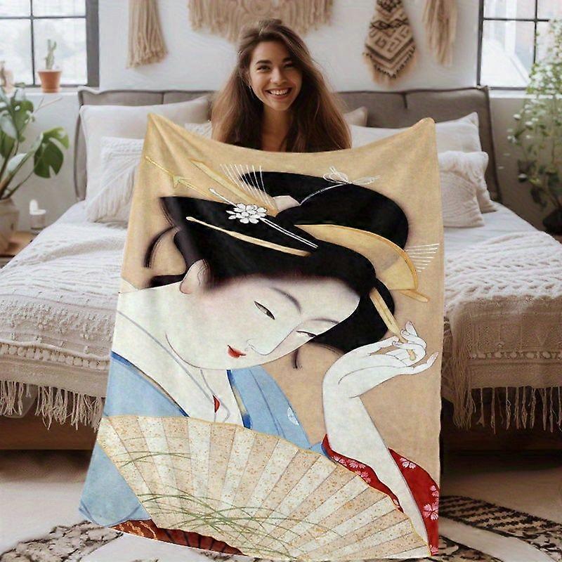 Elegant Maiko-Style Kimono Print Flannel Throw Blanket - Soft & Warm Polyester, All-Season Comfort for Bed, Sofa, Office-AZXVB94