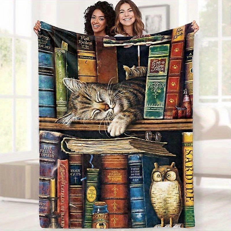 Cozy Vintage Cat & Bookshelf Print Flannel Blanket - Soft, Warm, and Plush, Ideal for Bed, Sofa, Car, Camping | All-Seas-AZXLK370