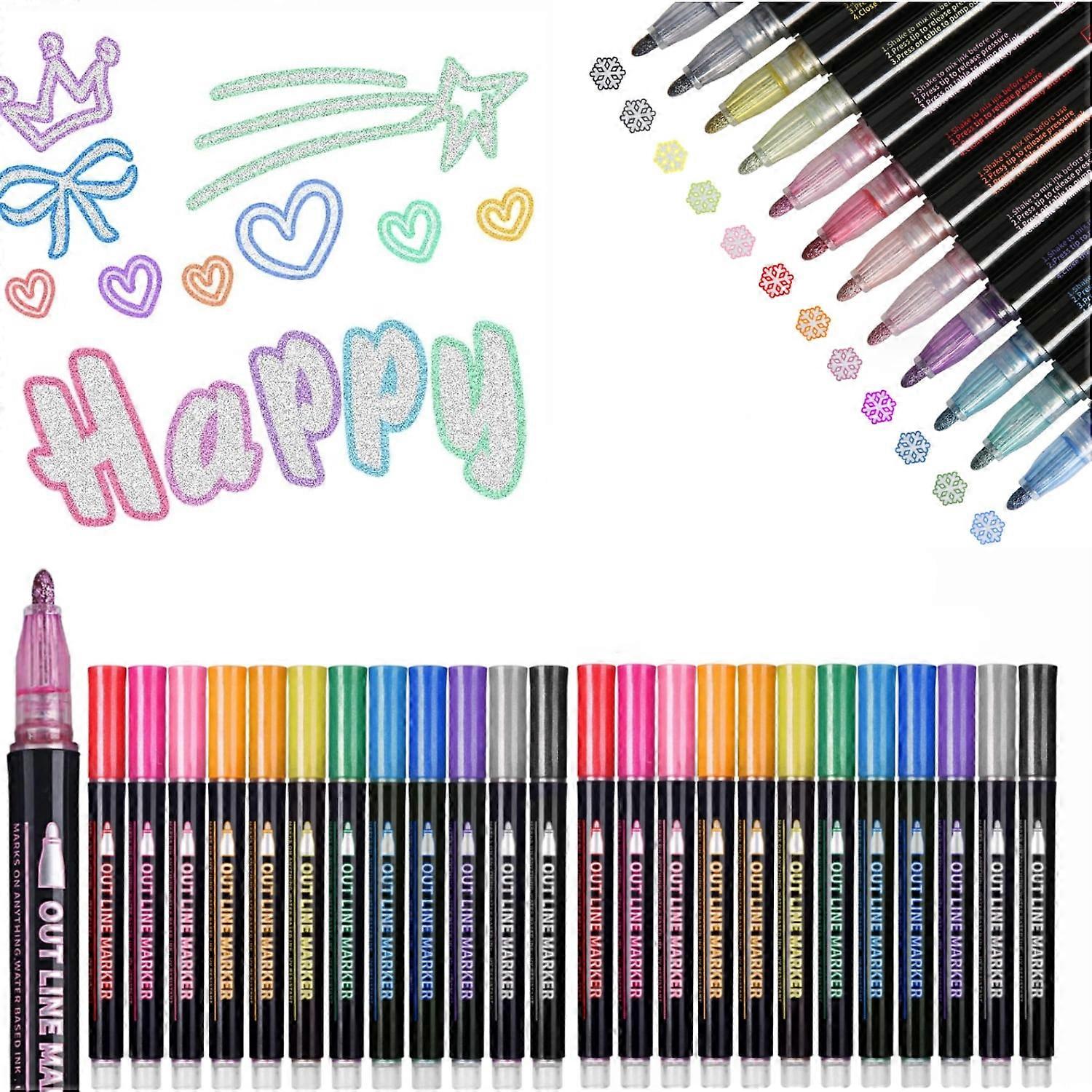 Scheam 36 Pcs Super Squiggles Shimmer Pens 12 Colors Silver Metallic Self-Outline Sparkling Glitter Permanent Markers Set for Card Making Scrapbook