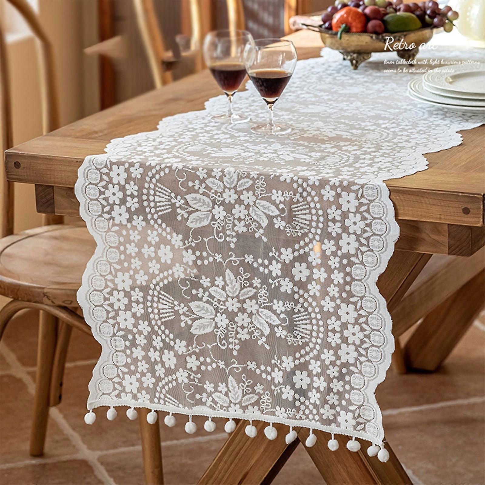 Twfbrm White Lace Table Runner 18"x47" - Floral Embroidered with Tassel, Rustic Boho Farmhouse Decor for Wedding, Bridal, Spring