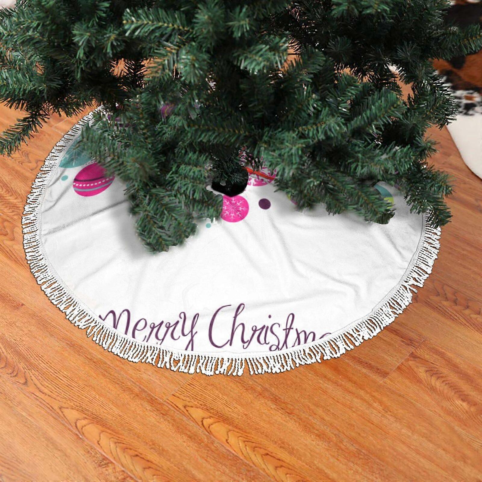 Christmas Fringed Lace Tree Skirt 30" with Colorful Baubles, Retro Snowflakes & Handwriting - Soft, Light & Great Touch