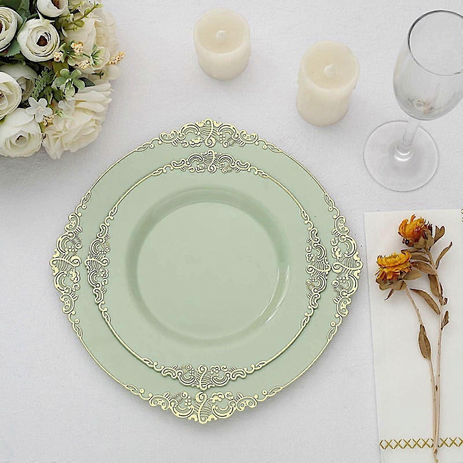 BalsaCircle 10 Sage Green Round 8" Disposable Plastic Salad Dinner Plates Gold Embossed Baroque Trim Party Events Decorations