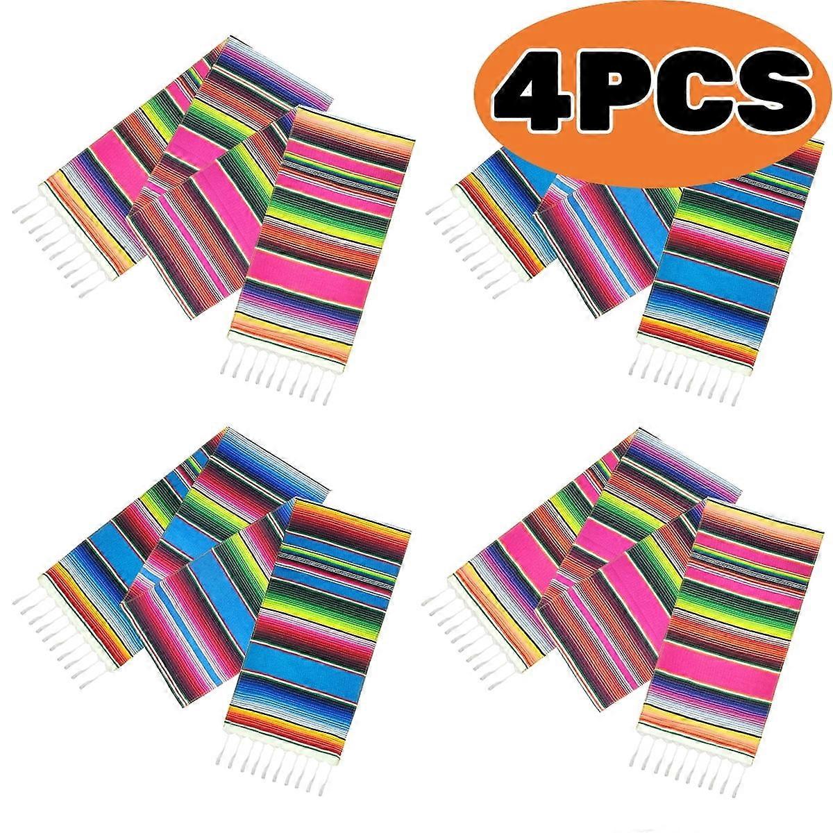 COLORFUL AND HAND-KNITTED -- Our Mexican table runners are beautifully hand-knitted and come in a set of four, including 2 rose red and 2 sky blue runners. Each runner measures 110" long and 14" wide. GOOD-QUALITY COTTON MATERIAL -- The four-side stitching process ensures durability and resistance to breakage. Day of the Dead decorations are also machine washable, easy to clean, and reusable. VERSATILE DECORATIONS -- These table decor are perfect for both indoor and outdoor home decor. Mexican decor are also suitable for various Mexican holiday celebrations, such as Cinco de Mayo, Day of the Dead (Dia de Muertos), and carnivals. FESTIVE ATMOSPHERE -- The fiesta decorations will bring a warm and happy festive atmosphere to your parties and events, leaving a lasting impression on your guests. VERSATILE USAGE -- These Dia De Muertos decorations can be used in multiple ways to suit your needs. Mexican party decorations are perfect as tablecloths, blankets, curtains, and home decorations. Additionally, they can be used as blankets, shawls, or scarves for clothing decoration or to keep you warm. Colorful Set: 4 hand-knitted runners in rose red and sky blue (110"x14"). Durable Cotton: Quality material with four-side stitching; machine washable. Versatile Use: Perfect for indoor/outdoor decor and Mexican celebrations. Festive Touch: Adds a lively, warm atmosphere to parties and events. Multi-Use: Ideal as tablecloths, blankets, curtains, or even clothing accents.