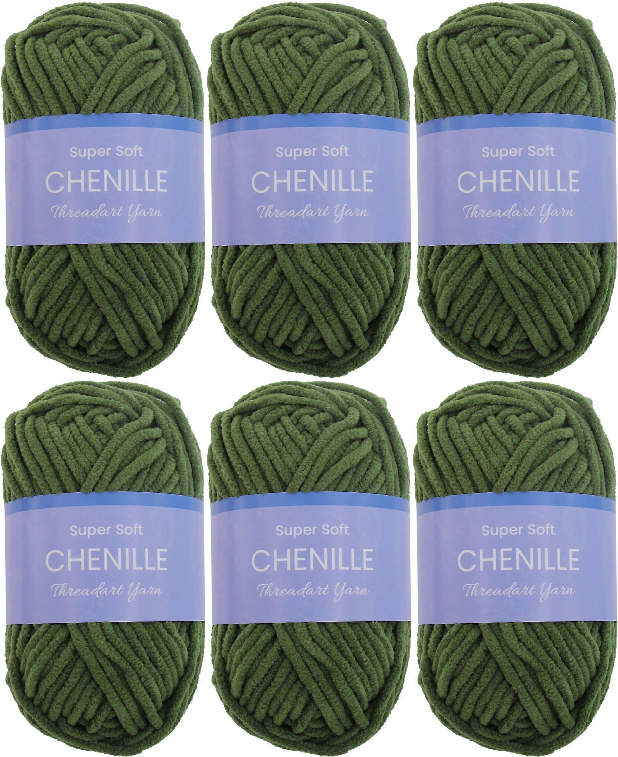 6 Pack ThreadArt Chenille Yarn for Crocheting, Knitting, Amigurumi, Super Soft Plush Velvet Yarn - 50 Gram 60 yds #5 Fluffy Yarn Skeins - Moss Green