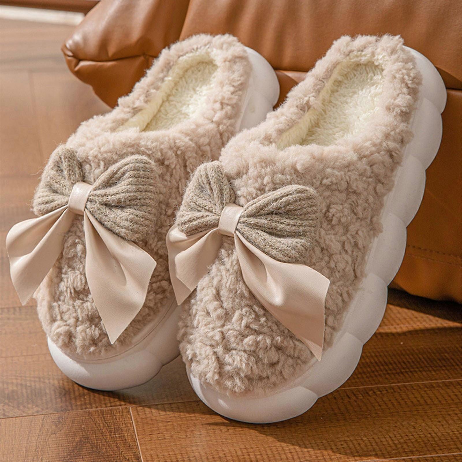 Warm Plush Bow Buckles Slippers for Women, Arch Support Moccasin with Faux Fur Lining, Anti-Skid Rubber Sole, Indoor Winter Bedroom Shoes