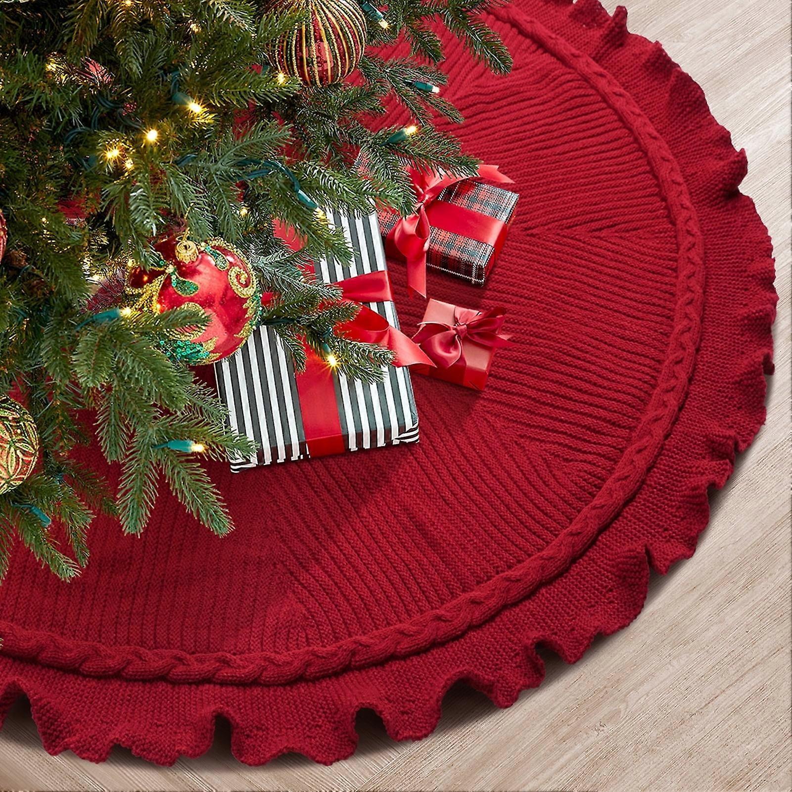 Ayieyill 48" Red Knitted Christmas Tree Skirt, Thick Rustic Xmas Decor for Holiday Indoor Party (Wave Red)